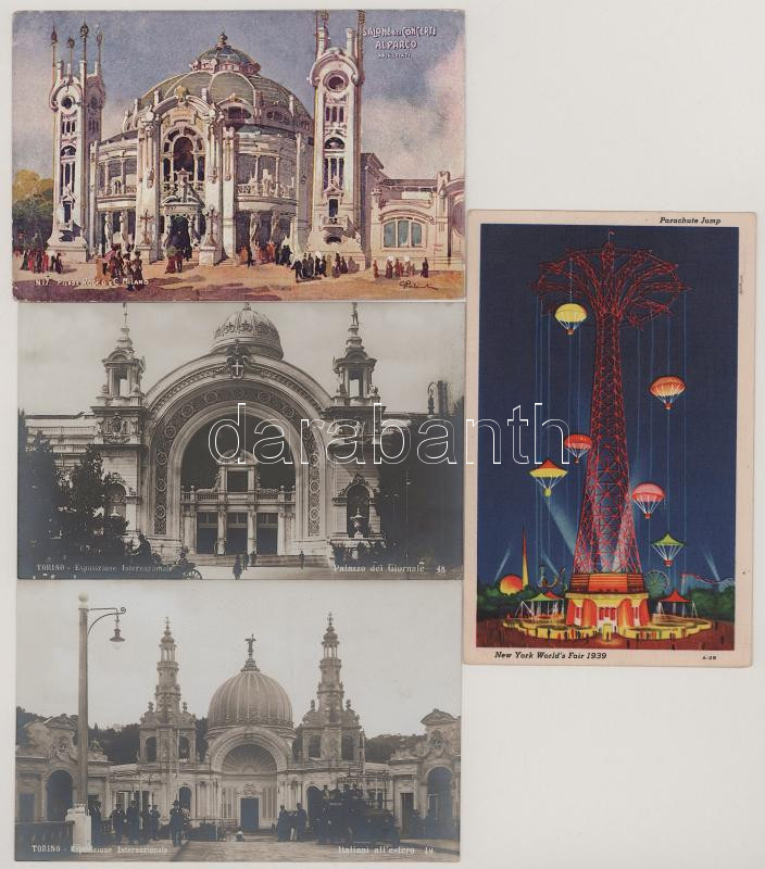 8 db RÉGI képeslap nemzetközi kiállításokról: Milano 1906, Torino 1911, New York 1939 / 8 pre-1945 postcards of international exhibitions: Milano 1906, Torino 1911, New York 1939