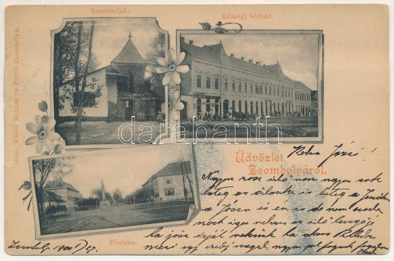 1900 Zsombolya, Hatzfeld, Jimbolia; Remete lak, Községi bérház, Fő utca, üzletek. Manzin és Ferch kiadása / villa, shops, main street. Art Nouveau, floral + "ORSOVA - BUDAPEST 76. SZ." vasúti mozgóposta bélyegző (szakadások / tears)