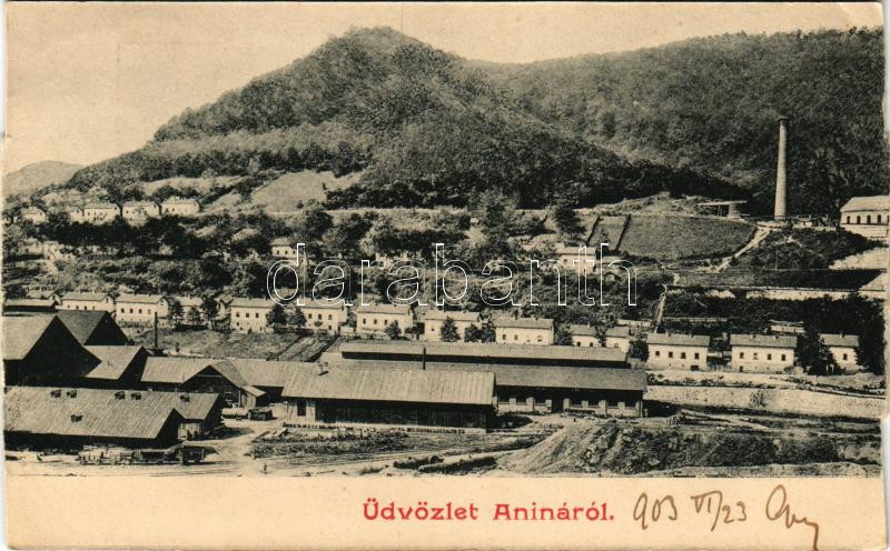 1903 Anina, Stájerlakanina, Stájerlak, Steierdorf; vasgyár látképe. Hiányos, eredetileg három részes kihajtható panorámalap középső eleme / iron works, factory. Middle item of a 3-tiled folding panoramacard (b)