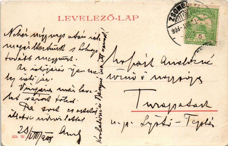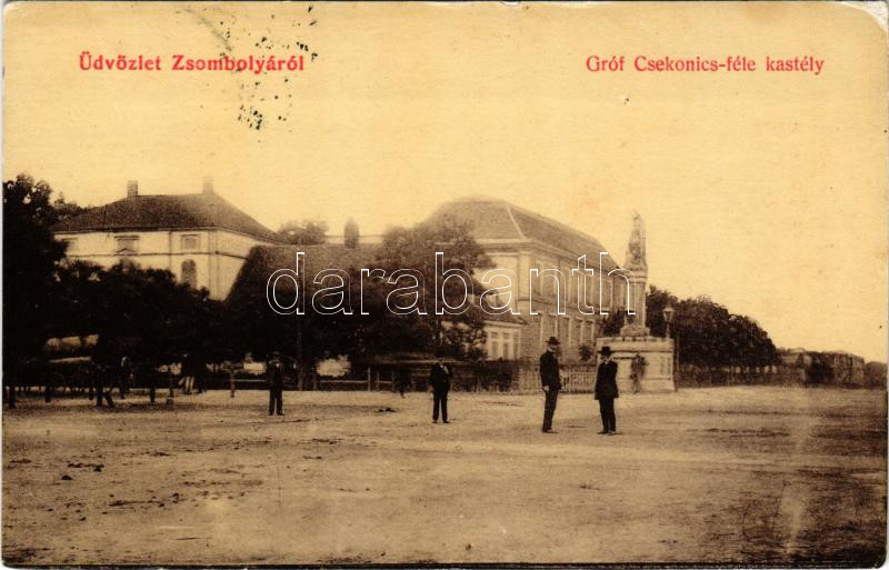 1908 Zsombolya, Hatzfeld, Jimbolia; Gróf Csekonics kastélya, Szent Flórián szobor. W.L. 424. / castle, monument (kis szakadás / small tear)