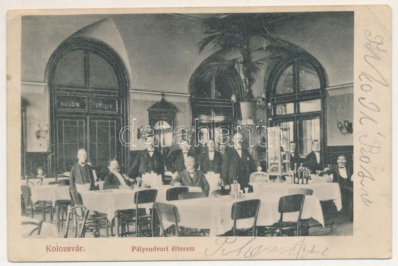 1913 Kolozsvár, Cluj; Pályaudvari étterem, vasúti vendéglő, belső vendégekkel és pincérekkel. Kruppa Károly kiadása, Divald Károly fia / railway station's restaurant, interior with guests and waiters (EK)