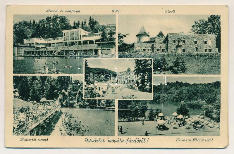 1943 Szováta-fürdő, Baile Sovata; Strand- és kádfürdő, Fő tér, Tivoli, Medve-tó strand, Terasz. leporellólap 10 képpel / spa, beach. leporellocard with 10 pictures