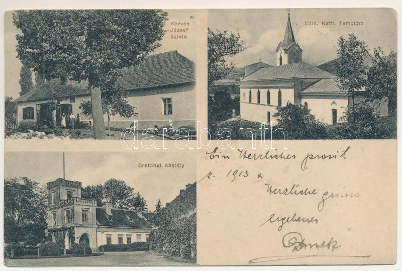 1918 Drétoma, Drietoma, Drithoma; Karvan József üzlete, római katolikus templom, Rakovszky-Chorinsky kastély / shop, church, castle