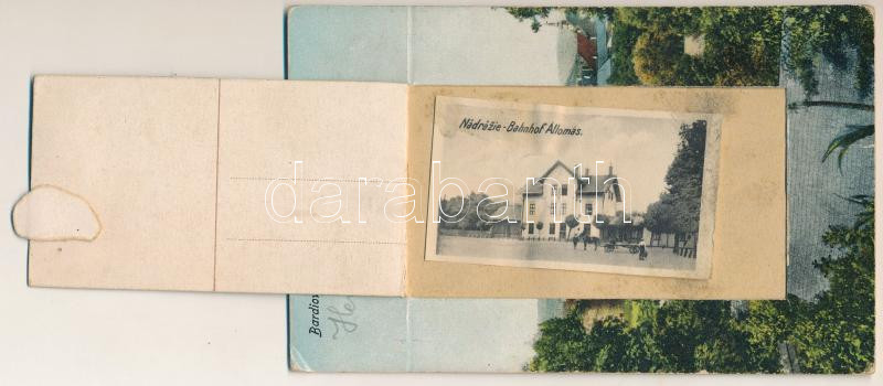 1926 Bártfa, Bártfafürdő, Bardejovské Kúpele, Bardiov, Bardejov; sérült leporellólap (tartalom hiányzik) 1 képpel: vasútállomás. Vdova Vilma kiadása / damaged leporellocard (missing insides) with 1 picture: railway station (b)