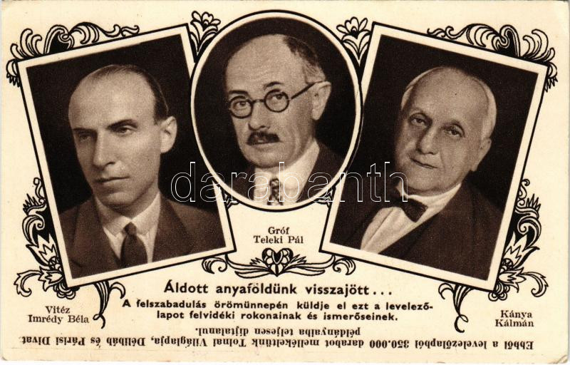 Felvidék visszacsatolásának emlékére. Áldott anyaföldünk visszajött... Vitéz Imrédy Béla, Gróf Teleki Pál, Kánya Kálmán. Tolnai Nyomda kiadása / Entry of the Hungarian troops, Irredenta, Art Nouveau (EK)
