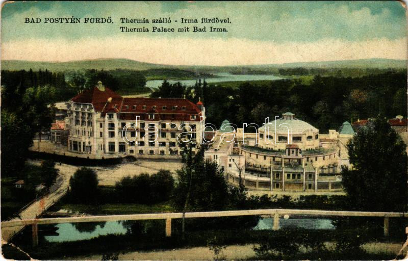 Pöstyén-fürdő, Kúpele Piestany; Thermia szálló az Irma fürdővel, hajóhíd. Schulcz Ignác kiadása / Thermia-Palace mit Bad Irma / hotel, spa, bath, pontoon bridge (EB)