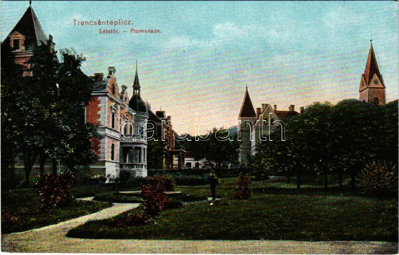 Trencsénteplic, Trencianske Teplice; Sétatér, templom. Wertheim Zsigmond kiadása / promenade, church (fl)