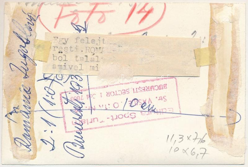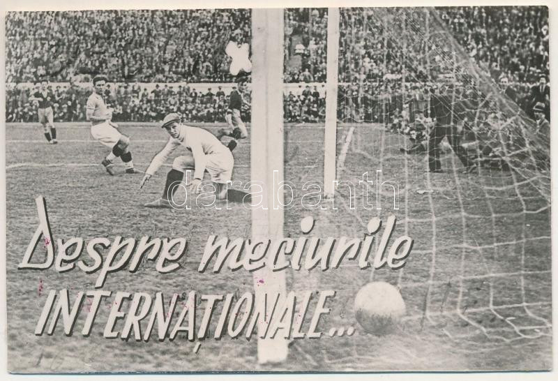 1934 Bucharest, Bukarest, Bucuresti, Bucuresci; 1934-es labdarúgó-világbajnokság-selejtező, Románia - Jugoszlávia 2:1 labdarúgó mérkőzés, Dobay István győztes gólja, hátoldalon saját jegyzete / World Cup qualification match, Romania - Yugoslavia 2:1, football match, players, with Stefan Dobay's note on the backside. sport photo (11,3 x 7,5 cm) (non PC) (ragasztónyomok / glue marks)