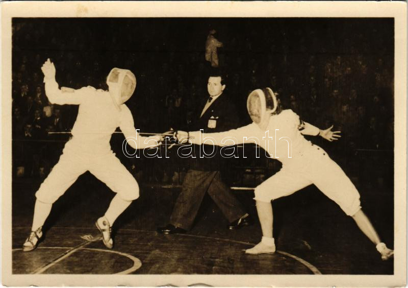 Nemzetközi női tőrvívó verseny a Sportcsarnokban. Magyar Foto, Sima Andor. Képzőművészeti Alap Kiadóvállalata / International Women's Foil Fencing Championship at the National Sports Hall in Budapest (apró szakadás / tiny tear)