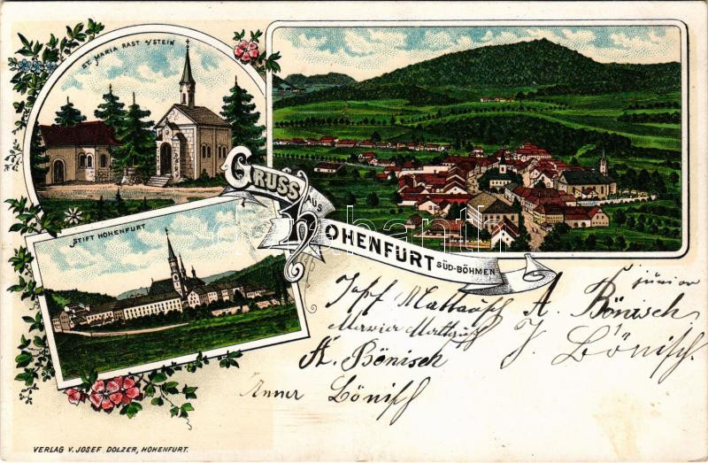 1899 Vyssí Brod, Hohenfurth (Südböhmen); St. Maria Rast a. Stein, Stift Hohenfurt. Verlag v. Josef Dolzer Art Nouveau, floral, litho (fl)