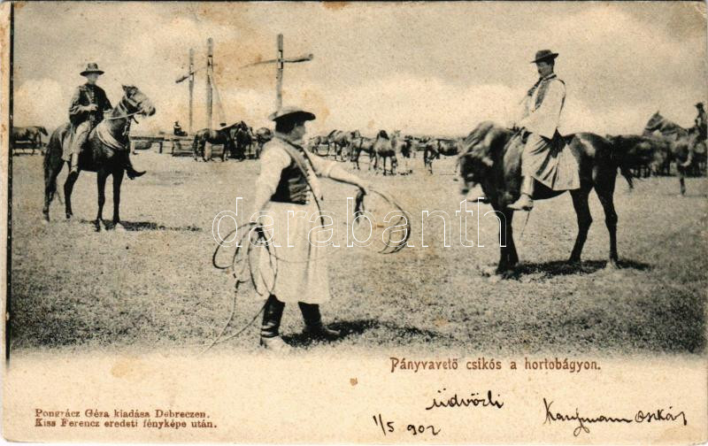1902 Hortobágy, pányavető csikós. Pongrácz Géza kiadása, Kiss Ferenc eredeti fényképe után (fl)