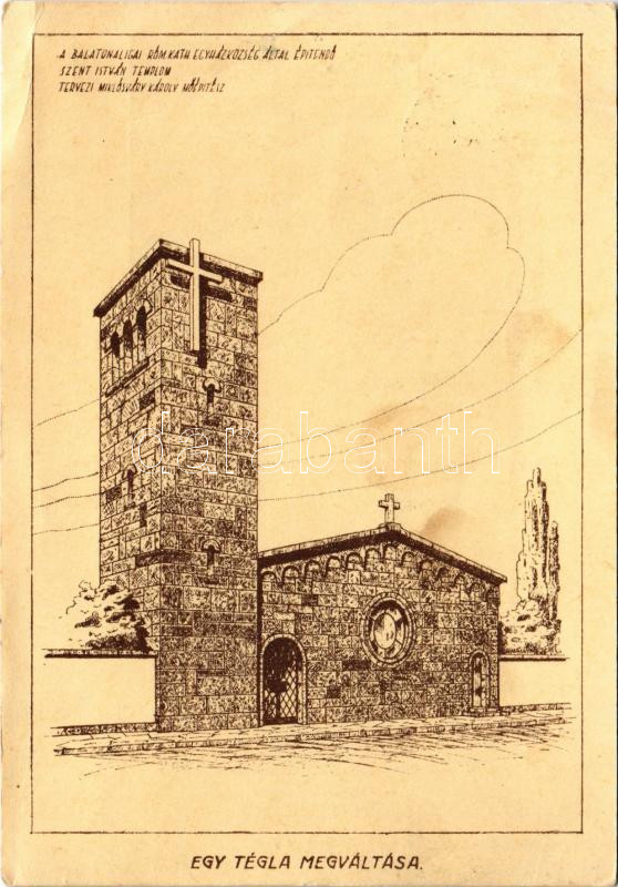 1944 Balatonaliga (Balatonvilágos), a római katolikus egyházközség által építendő Szent István templom, tervezi Miklósváry Károly műépítész. "Egy tégla megváltása" (EB)