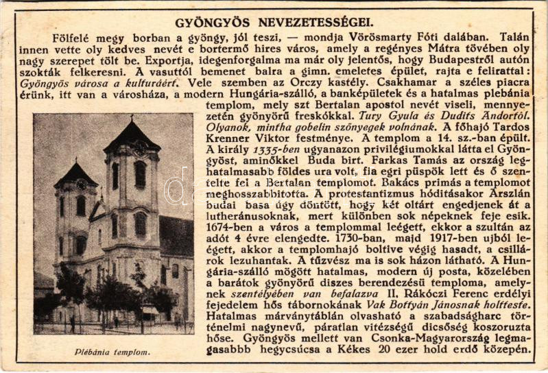 Gyöngyös, Város nevezetességei: plébánia templom. Farkasfalvi Kornél kiadása (vágott / cut)