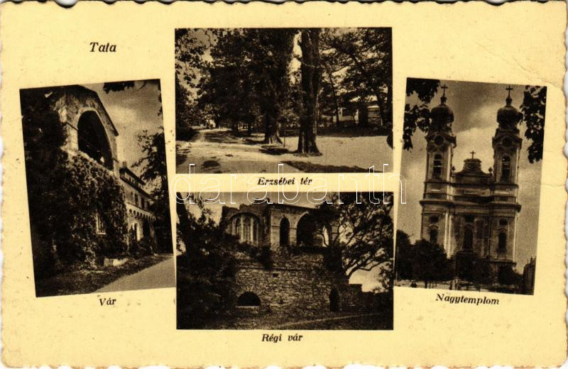 Tata, Tata-Tóváros; vár, Erzsébet tér, régi vár, nagytemplom. Lindenberg Adolf kiadása (EB)