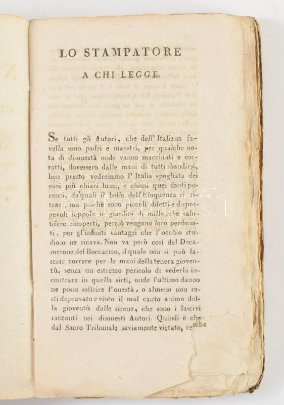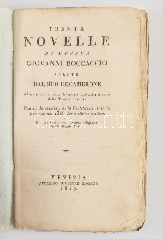 Trenta Novelle di Messer Giovanni Boccaccio scelte dal suo Decamerone (Boccaccio 30 novellája a Dekameronból válogatva ) Venezia, 1817. Giuseppe Gnoato. 240p.Korabeli kartonálásban, beíssáokkal / With contemporary inscribings and in cartboard binding