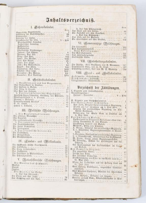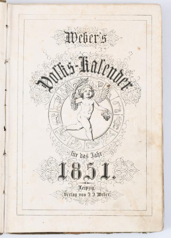 Weber's Volks-Kalender für das Jahr 1851. Mit zahlreichen Abbildungen u. Illustrationen. Leipzig, J. J. Weber, 1851. XVI + 144 + 8 p. Rézmetszetű illusztrációkkal. Korabeli kartonált papírkötésben