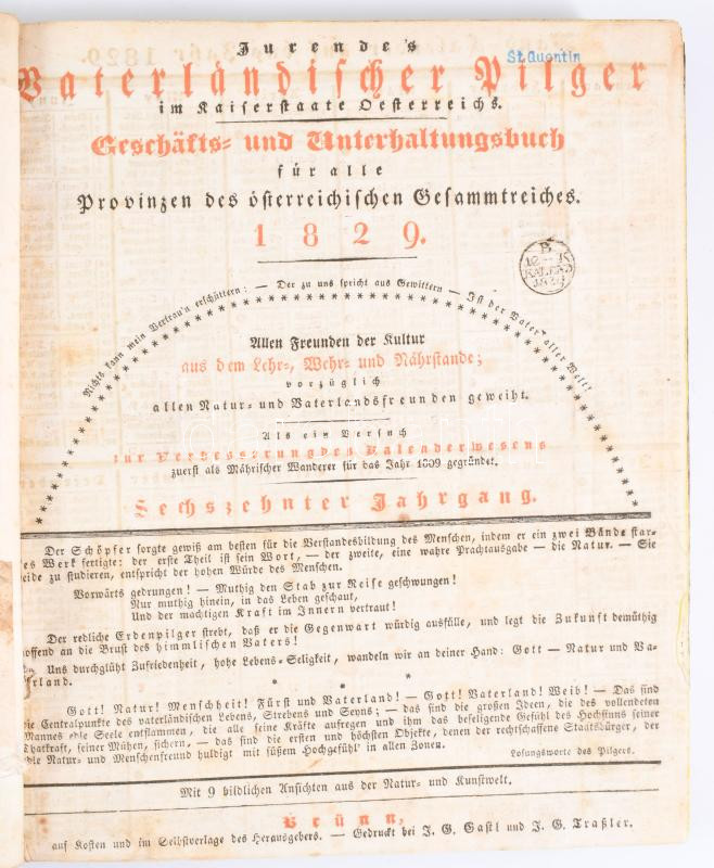 [kalendárium] 1829 Jurende's Vaterländischer Pilger im Kaiserstaate Österreichs. 1829. Geschäfts- und Unterhaltungsbuch für alle Provinzen des österreichischen Gesammtreiches. Sechszehnter Jahrgang. Brünn Selbstverlag, 1829. 1 kih rézm t. XVI. 372p.(3) Aranyozott korabeli félvászon kötésben
