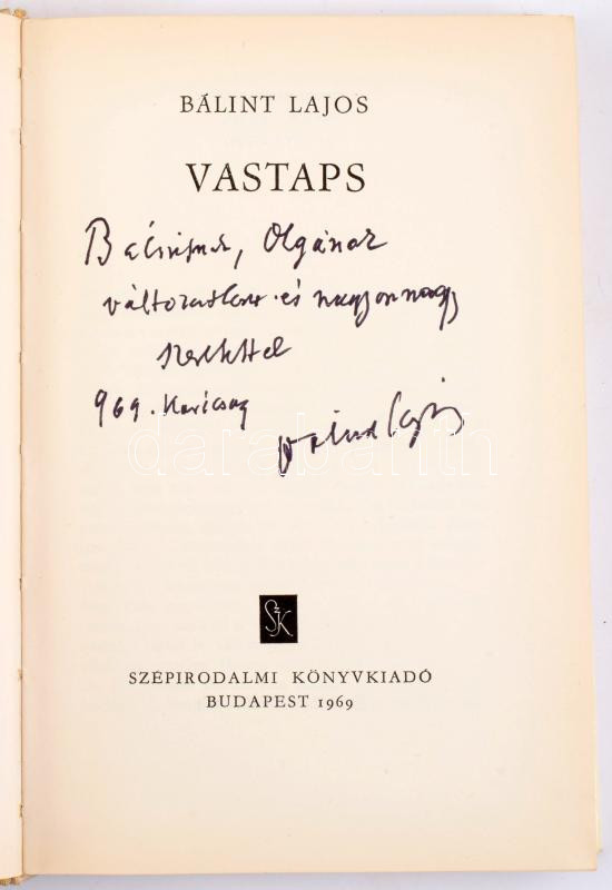 Bálint Lajos: Vastaps. A szerző, Bálint Lajos (szül. Bleier) (1886-1974) műkritikus, dramaturg, író, műfordító által dedikált példány! Bp., 1969, Szépirodalmi Könyvkiadó, 278+[2] p. Első kiadás. Kiadói egészvászon-kötés, kissé viseltes kiadói papír védőborítóban.