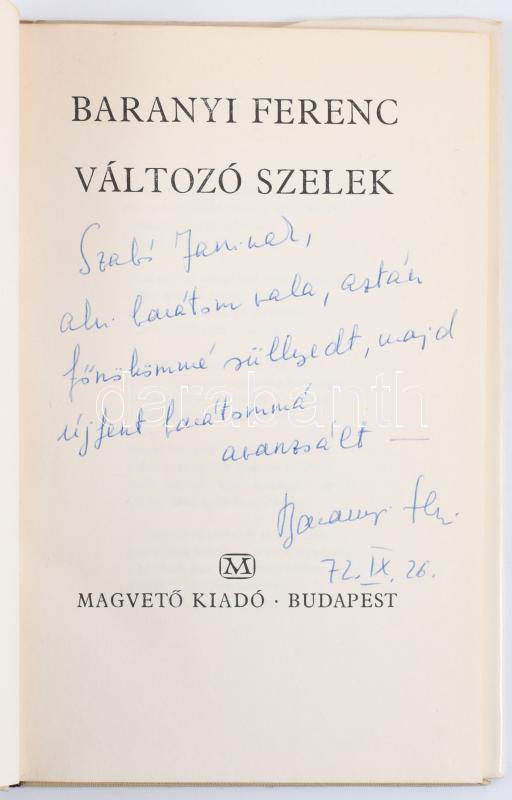 Baranyi Ferenc: Változó szelek. DEDIKÁLT! Bp.,1972,Magvető. 1. kiadás. Kiadói egészvászon-kötés, kiadói papír védőborítóban.