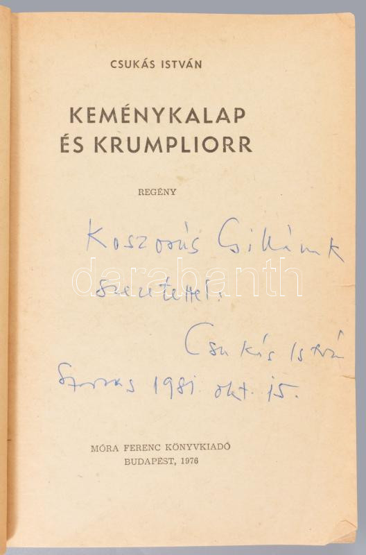 Csukás István: Keménykalap és Krumpliorr Dedikált példány! Budapest, 1976, Móra Ferenc Ifjúsági Könyvkiadó (Szikra Lapnyomda, Budapest), 239 p. +[7] p., ill. Szerző által dedikált példány. A "Delfin könyvek" c. sorozatban megjelent kötet Kiadói papírborítóval, gerincen kis sérüléssel