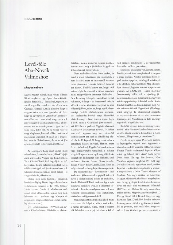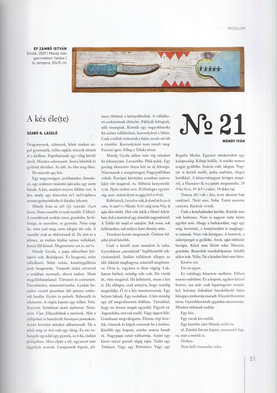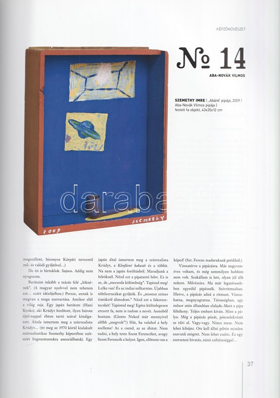 A tartalomból: Nádas Péter: Barcsay ecsetje [Fehér László "Barcsay ecsetje" című montázsáról] -- Kukorelly Endre: Melós sállal [Szurcsik József "Uram, a sálja" című kompozíciójáról] -- Sándor György: Levél-féle Aba-Novák Vilmoshoz [Szemethy Imre: "Abánk pipája" című műalkotásáról] -- Szakonyi Károly: Drong pápaszeme [Madarassy István: "Szemüveg és levél" című Gyurkovics-installációjáról] -- Szabó G. László: A kés éle(te) [ef Zámbó István: "Emlék 2009" / Mándy István gyermekkori fakése című kompozíciójáról] -- Margócsy István: Egy példánnyi Nemzeti dal [Győrfi András: "A szabadság első lélekzete" című Petőfi-montázsáról] -- Tandori Dezső: Az Egyes Mezőtől a Végtelenig [Pauer Gyula: "Fekete Párduc /Grosics Gyula trikója" című installációjáról].