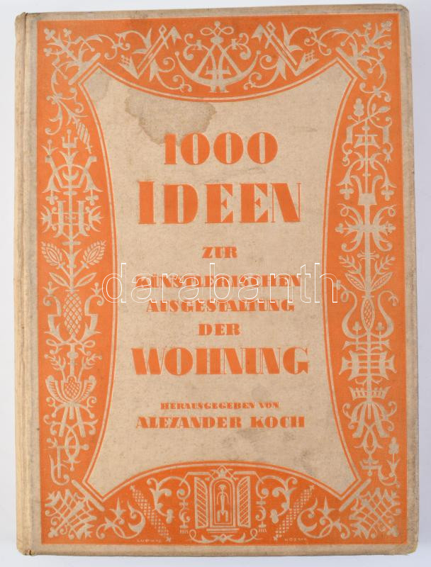 Koch, Alexander (szerk.): 1000 Ideen zur künstlerischen Ausgestaltung der Wohnung. Darmstadt, 1926, Verlagsanstalt Alexander Koch. Gazdag fekete-fehér és színes képanyaggal illusztrálva. Német nyelven. Kiadói egészvászon-kötés, kissé viseltes, foltos borítóval, helyenként kissé foltos lapokkal, néhány kijáró képtáblával, ex libris-szel.