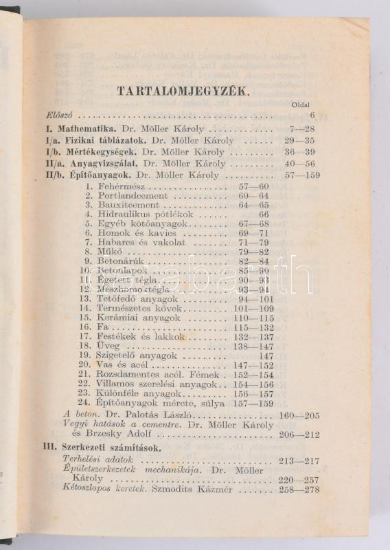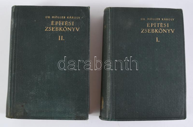 Möller Károly: Építési zsebkönyv. I-II. köt. Bp., 1938, Kir. M. Egyetemi Nyomda, 1119 p.; 1112 p. Kiadói egészvászon-kötés, kissé kopott borítóval, helyenként kissé foltos lapokkal.