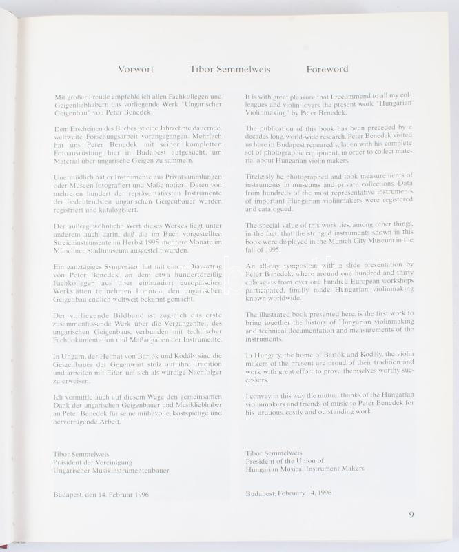Peter Benedek: Ungarischer Geigenbau. Dokumentation der im Herbst 1995 im Münchener Stadtmuseum ausgestellten Instrumente. / Violin Makers of Hungary. A detailed documentation of the 1995 Exhibition of Violins presented at the Stadtmuseum in Munich, Germany. (Kiállítási katalógus.) München, 1997, szerző, 445 p. Gazdag képanyaggal illusztrálva. Német és angol nyelven. Kiadói egészvászon-kötés, jó állapotban, kissé viseltes kiadói papír védőborítóban.