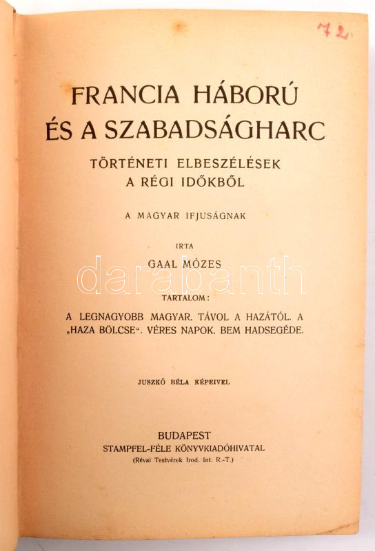 Gaal Mózes: Francia háború és a szabadságharc. Történeti elbeszélések a régi időkből a magyar ifjúságnak. Bp., Stampfel. Kiadói festett, aranyozott egészvászon kötés, kopottas állapotban.
