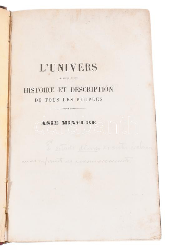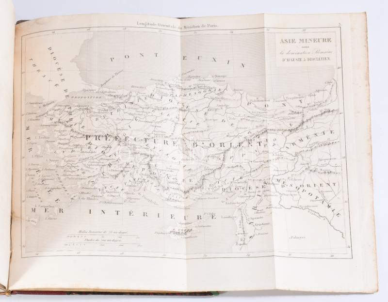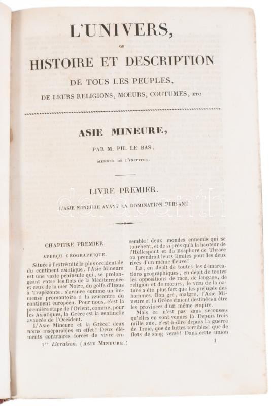 Philippe Le Bas: Asie Mineure depuis les temps les plus anciens jusqu'á la bataille d'Ancyre, En 1402. Par M. - -, ... Terminée par M. Chéron, .... L'Univers. Histoire et Description de Tous Le Peuples. Paris,1853.,Firmin Didot Fréres, 4+530 p+32 (fekete-fehér képtáblák, egy hiánnyal (10 t.) t.+4 (kihajtható térképek) t. Francia nyelven. Korabeli aranyozott gerincű, álbordás félbőr-kötés, aranyozott felső lapélekkel, kopott borítóval, kissé foltos lapokkal, a gerincen kis sérüléssel, a hátsó táblán kis lyukkal.