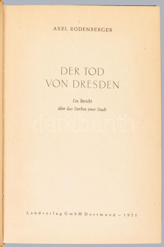 Rodenberger, Axel: Der Tod von Dresden. Ein Bericht über das Sterben einer Stadt. Dortmund, 1951, Landverlag. Német nyelven. Fekete-fehér fotókkal illusztrált. Kiadói papírkötés.