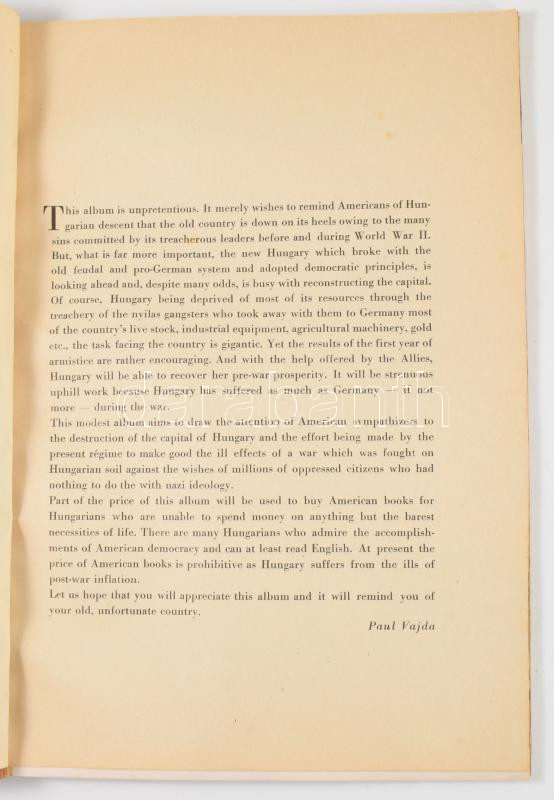 The Decline and Rise of Budapest. [red., intr.] Paul Vajda. Budapest, 1946. Móricz Miklós Printing House. [4] p. + 23 t. (8 kétoldalas). Egyetlen kiadás.A magyar származású amerikai olvasók számára készített Budapest-album a háborús pusztítás és újjáépítés képeivel.