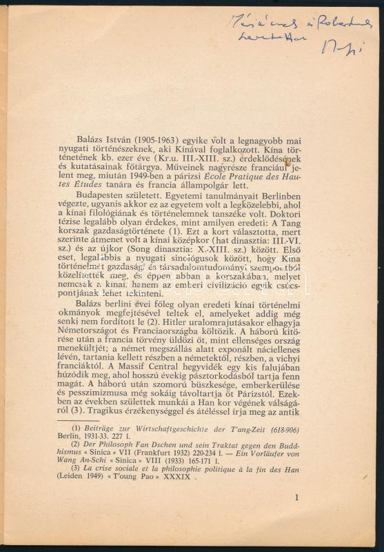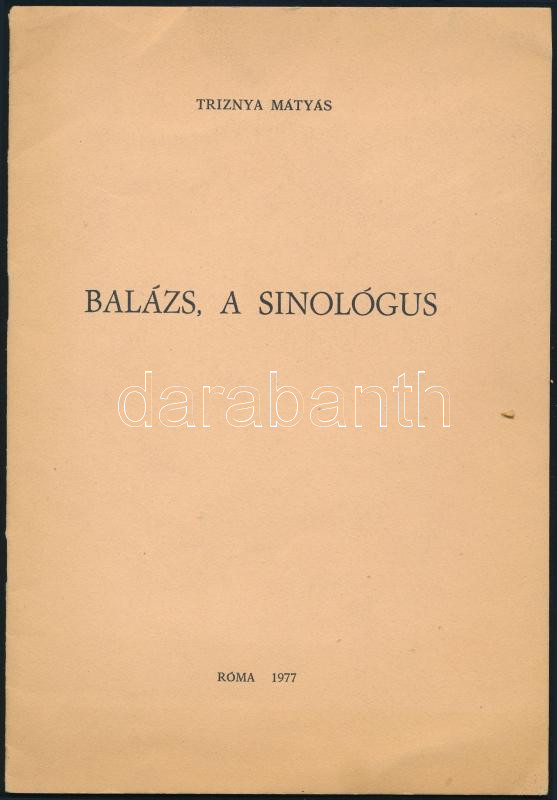 Triznya Mátyás: Balázs, a sinológus. Róma, 1977. 8p. Papírkötésben, jó állapotban.