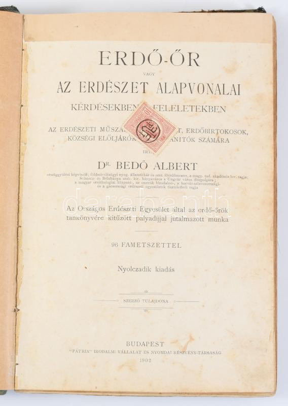 Bedő Albert: Erdő-őr, vagy Az erdészet alapvonalai, kérdésekben és feleletekben. Az erdészeti műszaki segédszemélyzet, erdőbirtokosok, községi elöljárók és néptanítók számára. Bp., 1902, ("Pátria"-ny.), XVI+323 p. 8. kiadás. Átkötött félvászon-kötés, kopott borítóval, javított címlappal, foltos lapokkal, néhány lapon bejelöléssel.
