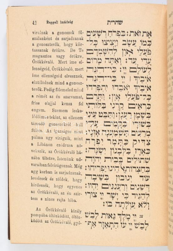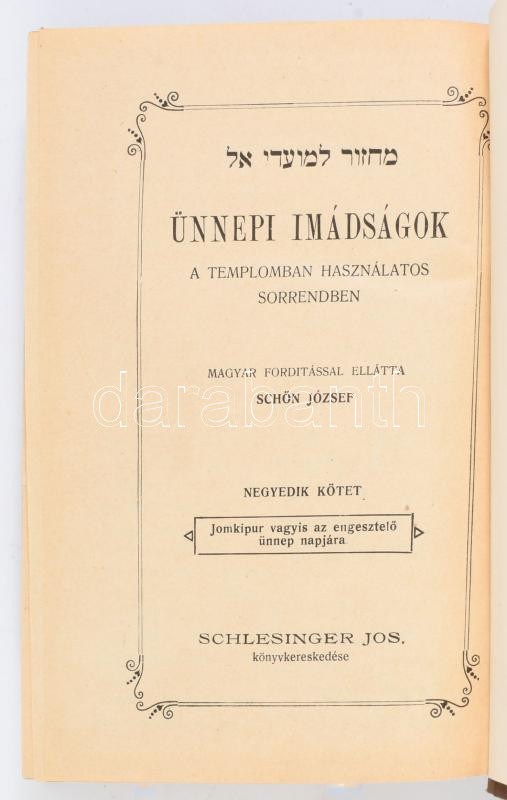 Ünnepi imádságok a templomban használatos sorrendben. III-IV. köt. III. köt.: Kol-nidre vagyis az engesztelÅ‘ nap elÅ‘zÅ‘ való estéjére. IV. köt.: Jomkipur vagyis az engesztelÅ‘ ünnep napjára. Ford.: Schön József. hn., én., Schlesinger Jos, 2+96+16 p.; 2+528+2 p. Kiadói félvászon-kötések, kopott borÃtóval.