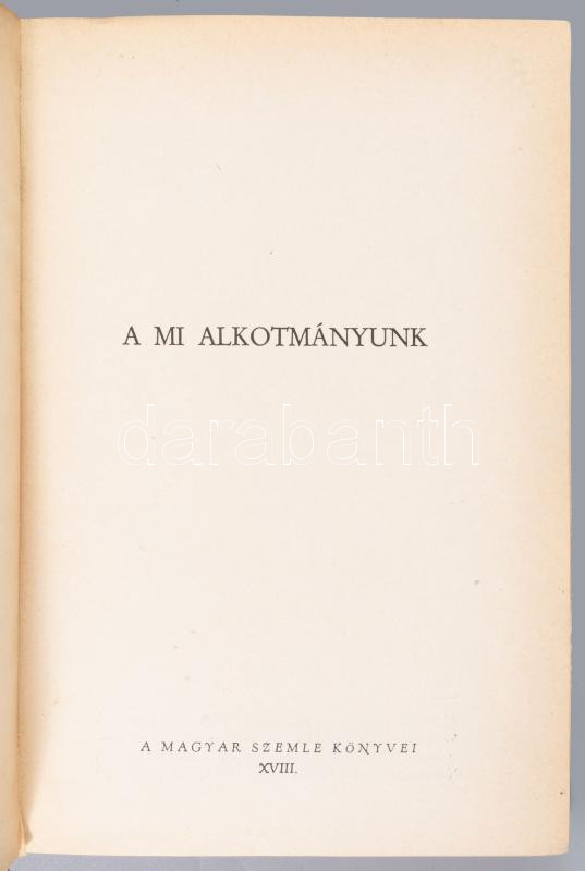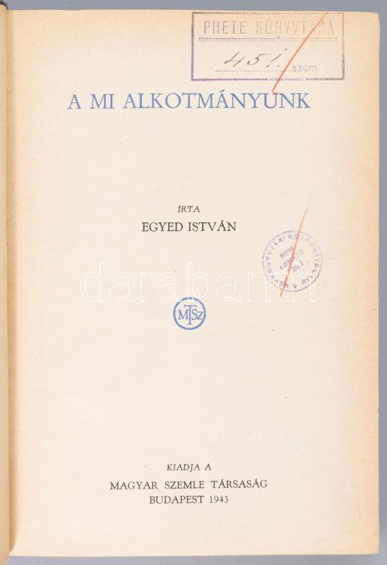 Egyed István: A mi alkotmányunk. Bp., 1943, Magyar Szemle Társaság,373+3 p. Kiadói félvászo-kötésben, kopott borítóval, a borítón és a gerincen címkével, régi intézményi bélyegzésekkel.