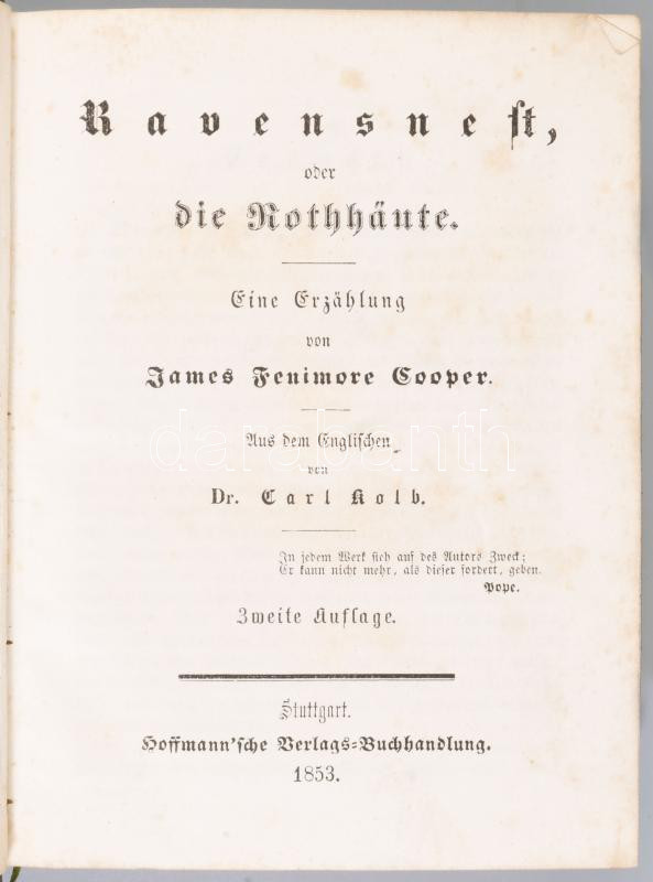 Cooper, James Fenimore: Ravensnest, oder die Rothhäute. Eine Erzählung. Stuttgart, 1853. Hoffmann, 1t XVI. 675p .Aranyozott félvászon kötésben