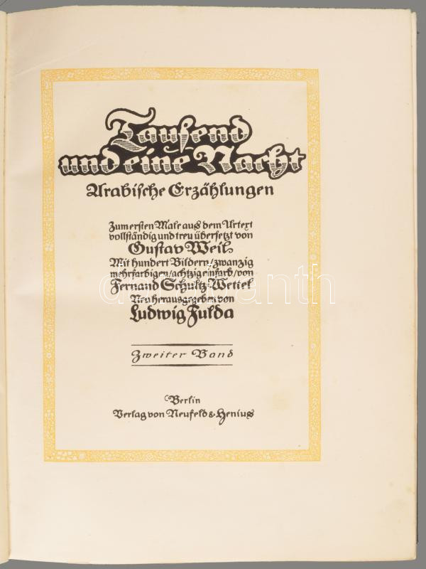 Tausend und eine Nacht. Arabische Erzählungen. Zum ersten Male aus dem Urtext vollständig und treu übersetzt von Gustav Weil. Neu hrsg.von Ludwig Fulda. 1-4. (Teljes) Berlin, 1913 Neufeld & Henius. Kiadói, aranyozott egészvászon kötésben, egyik kötet füzésénél szétvált