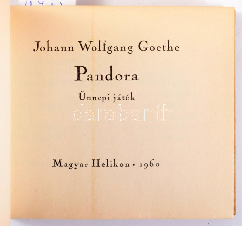 Goethe, Johann Wolfgang: Pandora. Ünnepi játék. 1960, Magyar Helikon. 345. számozott példány. Félbőr kötésben, kissé kopottas állapotban.