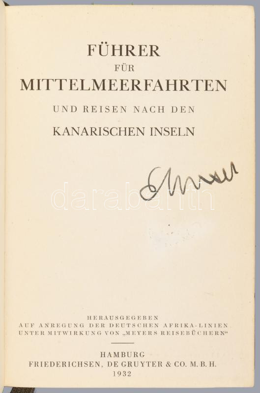 Führer für Mittelmeerfahrten und Reisen nach den Kanarischen Inseln. Herausgegeben auf Anregung der deutschen Afrika-Linien unter Mitwirkung von "Meyers Reisebüchern". Hamburg, Friedrichsen, 1932. De Gruyter & Co., 180p. XVIII. Kihajtható és egészoldalas térképekkel. Kiadói egészvászon kötésben ,ceruzás beírásokkal