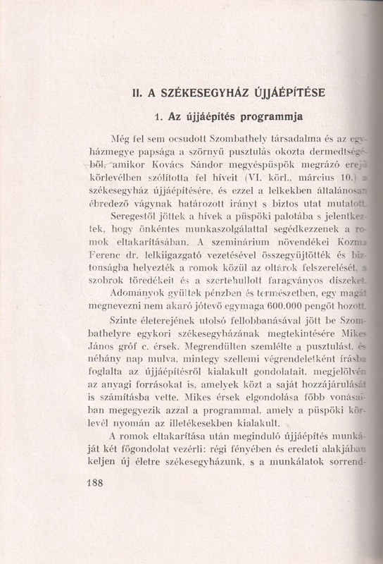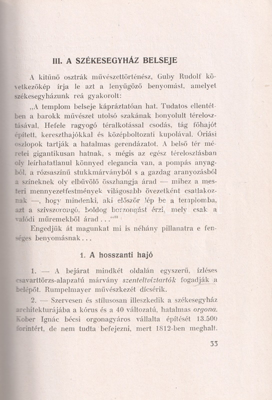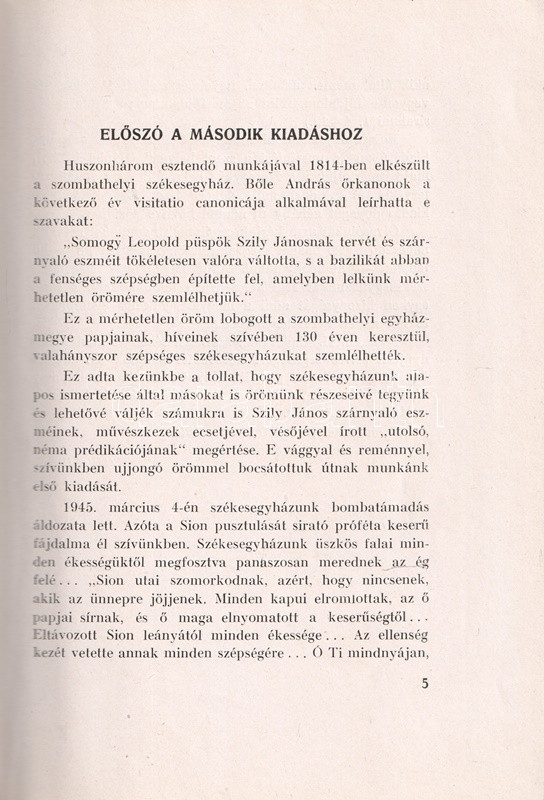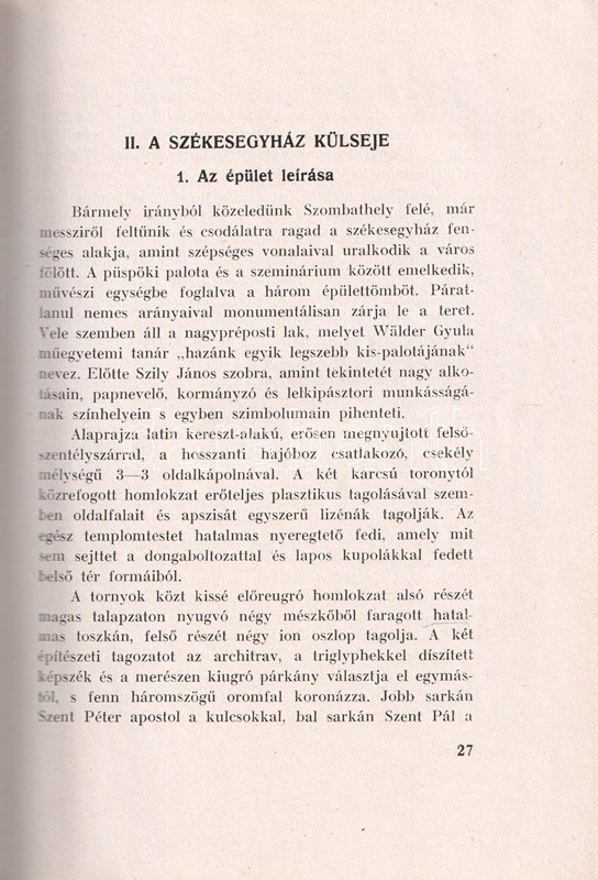Géfin Gyula (1889-1973) teológiai tanár, egyháztörténész kötete az 1791-1814 között klasszicizáló késő barokk stílusban épült szombathelyi Sarlós Boldogasszony-székesegyház építéstörténetét és művészeti értékeit vizsgálja. A neves festők, szobrászok által díszített székesegyház az ország egyik legnagyobb temploma. A társadalomtörténeti keretbe foglalt értekezés első kiadása 1943-ban jelent meg, a munka második kiadásának szomorú aktualitást adott a templomot ért bombatámadás, a templom helyreállítására gyűjtést indítottak. A 79-169. oldal között képmelléklet a templom eredeti állapotát ábrázolja, a 193-205. oldal közötti képanyag a világháborús rombolás mértékét dokumentálja.