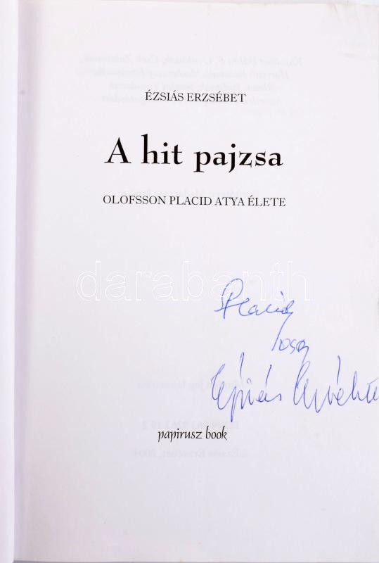 Ézsaiás Erzsébet: A hit pajzsa. Olofsson Placid atya élete. Oloffson Placid atya (1917-2016) és Ézsiás Erzsébet (1950-) író által ALÁÍRT példány! Bp., 2004, Papirusz Book. Kiadói papírkötés.
