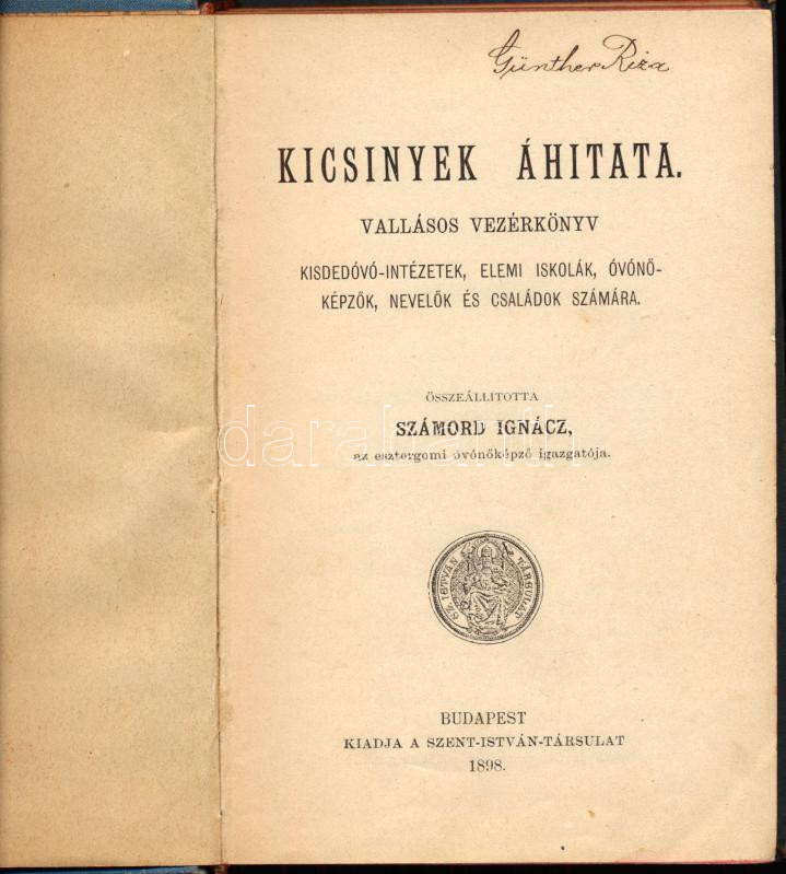 Számord Ignác: Kicsinyek áhitata. Vallásos vezérkönyv kisdedóvó-intézetek, elemi iskolák, óvónőképzők, nevelők és családok számára. Összeáll.: - - . Bp., 1898, Szent István-Társulat, 256 p. Aranyozott egészvászon-kötésben, kissé foltos, kopottas borítóval, tulajdonosi névbejegyzéssel.