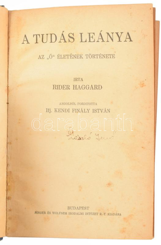 Rider Haggard: A tudás leánya. Az "ő" életének története. Bp., 1923, Singer és Wolfner. Félvászon kötés, kopottas állapotban.