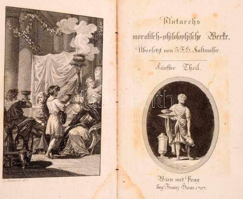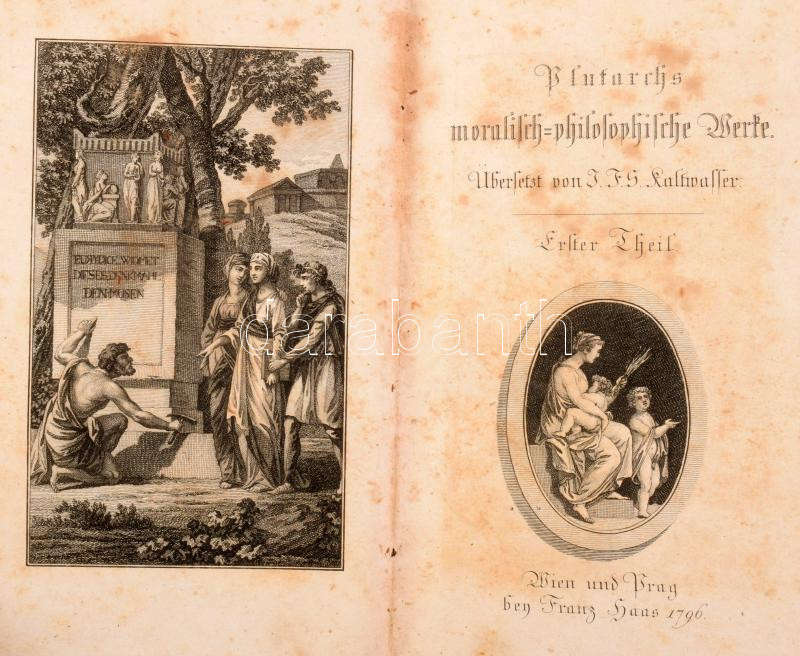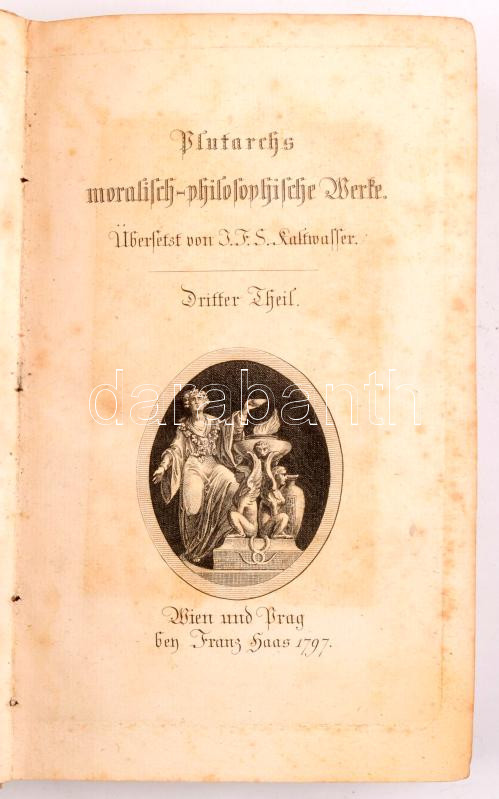 [Plutarkhosz]: Plutarchs moralisch-philosophische Werke. Übersetzt von J[ohann] F[riedrich] S[alomon] Kaltwasser. I., II., III., V. kötetek. Wien-Prag, 1796-1797, Franz Haas, 2 (rézmetszetű cÃmkép és cÃmlap) t.+ IV+470+[2] p.; 2 t.+ 458+[6] p.; 2 t.+ 421+[1] p.; 2 t.+ 553+[7] p. Német nyelven. Kartonált papÃrkötésben, viseltes állapotban, kopott, sérült, foltos borÃtókkal, foltos lapokkal, néhány sérült, kijáró lappal.