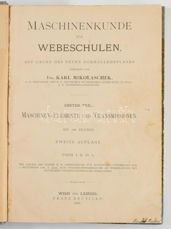 Mikolaschek Maschinenkunde für Webeschulen 1-2 . Wien, 1907. Deuticke. 188 illusztrációval. 93p., 126p., + számos egészoldalas és kihajtható illusztráció. Félvászon kötésben.