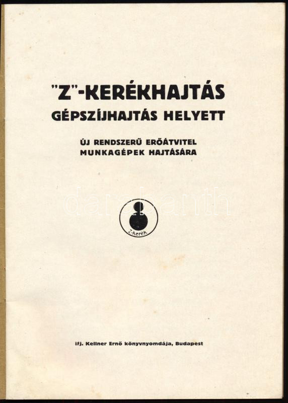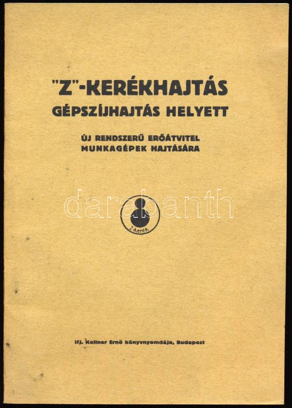 "Z"-kerékhajtás gépszíjhajtás helyett. Új rendszerű erőátvitel munkagépek hajtására. Bp., [1943], ifj. Kellner Ernő-ny., 14+[2] p. Fekete-fehér képekkel illusztrálva. Kiadói tűzött papírkötés.