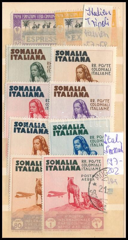 Olasz érdekeltségek, Tripoli, Szomália, Fiume, Albánia 21 db bélyeg, kis kétoldalas berakólapon
