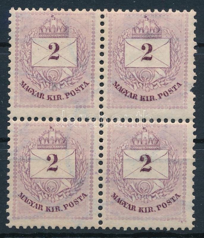 1881 2kr négyestömb elfogazva (felső jobb bélyegen hiányzó fog / missing perf on the right)
