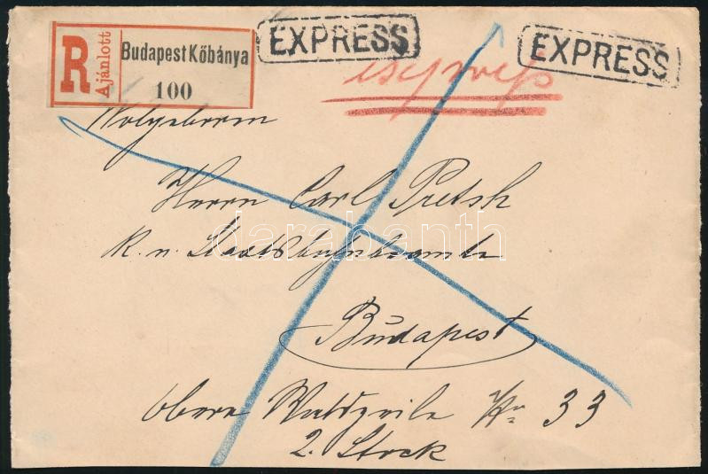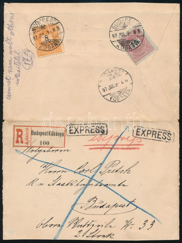 1897 Helyi ajánlott expressz levél 23kr-os tarifahelyes darab, 3kr (helyi levél díj) + 5kr (ajánlási díj) + 15kr (expressz díj) rendkívül ritka RRR! Kiállítási célból kinyitva.